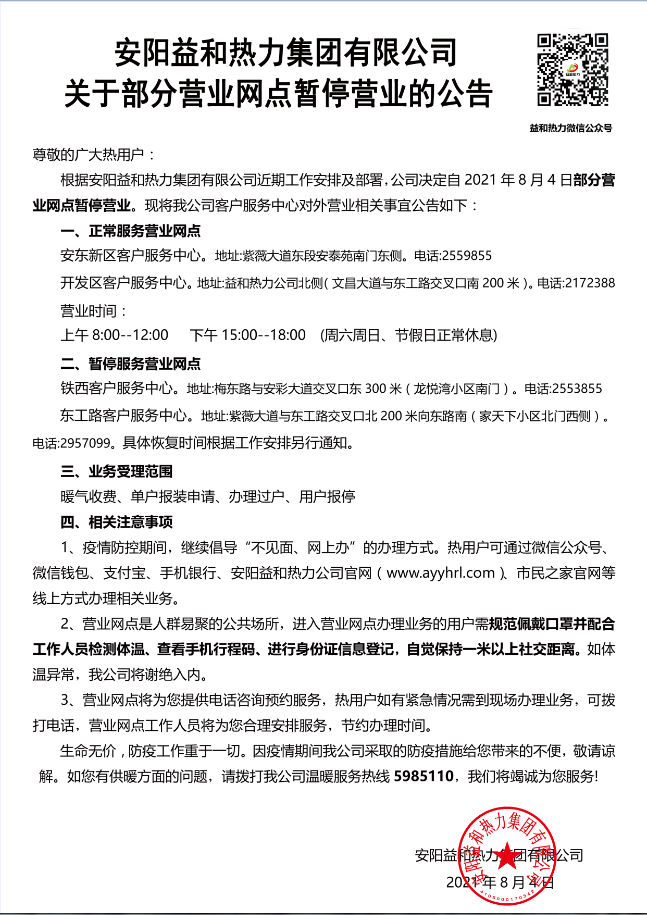 安阳益和热力集团有限公司设立优化营商环境专线公示